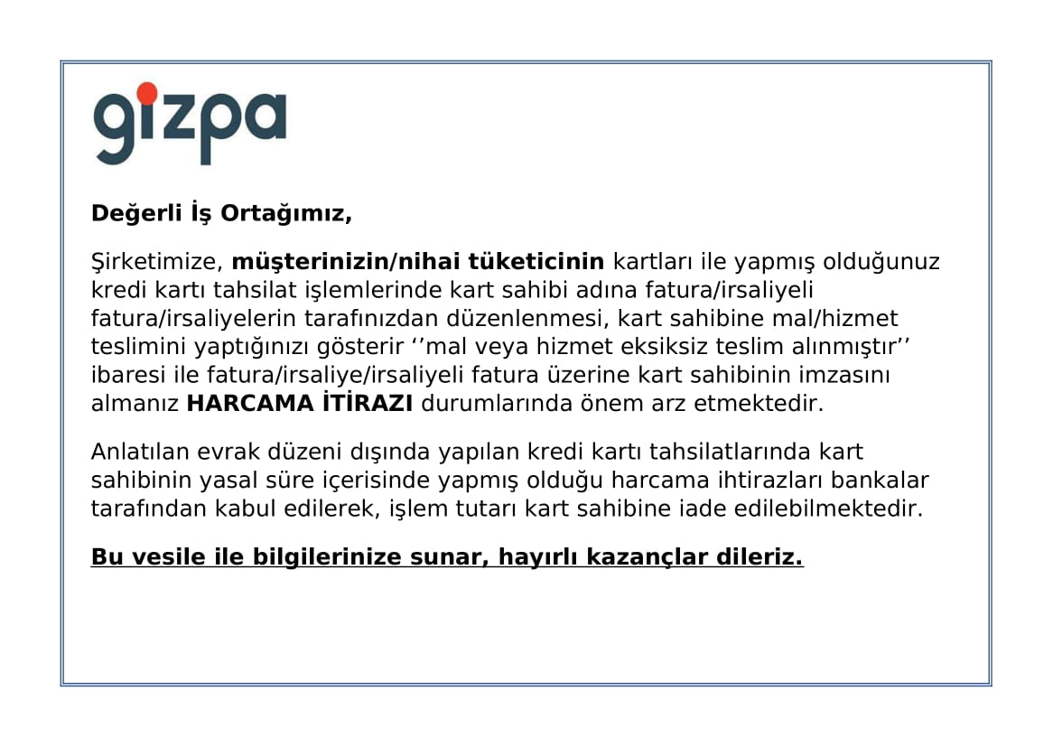 Şirketimize, müşterinizin/nihaitüketicinin kartları ile yapmış olduğunuz kredi kartı tahsilat işlemlerindekart sahibi adına fatura/irsaliyeli fatura/irsaliyelerin tarafınızdandüzenlenmesi, kart sahibine mal/hizmet teslimini yaptığınızı gösterir ‘’malveya hizmet eksiksiz teslim alınmıştır’’ ibaresi ile fatura/irsaliye/irsaliyelifatura üzerine kart sahibinin imzasını almanız HARCAMA İTİRAZI durumlarındaönem arz etmektedir.