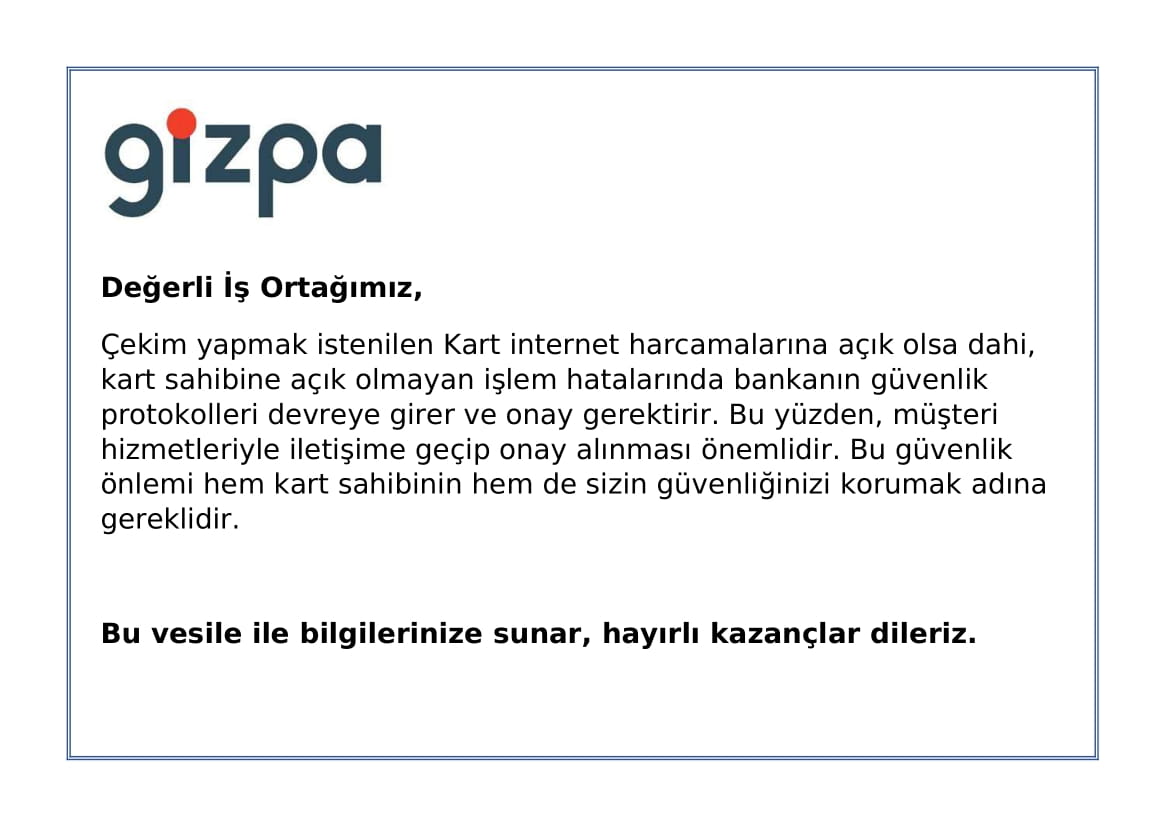 Çekim yapmak istenilen Kart internetharcamalarına açık olsa dahi, kart sahibine açık olmayan işlem hatalarındabankanın güvenlik protokolleri devreye girer ve onay gerektirir. Bu yüzden,müşteri hizmetleriyle iletişime geçip onay alınması önemlidir. Bu güvenlikönlemi hem kart sahibinin hem de sizin güvenliğinizi korumak adına gereklidir.