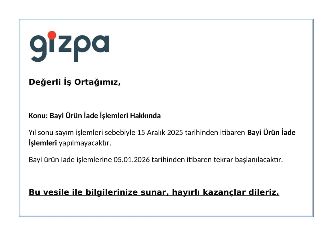 Yıl sonu sayım işlemleri sebebiyle 15 Aralık2025 tarihinden itibaren Bayi Ürün İade İşlemleriyapılmayacaktır.
